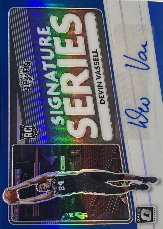 The Devin Vassell 2020 Optic #SS-DVS Signature Series - Blue /25 Rookie card in Raw condition has not changed in price in the last 30 days and was last sold for $25.00 .
