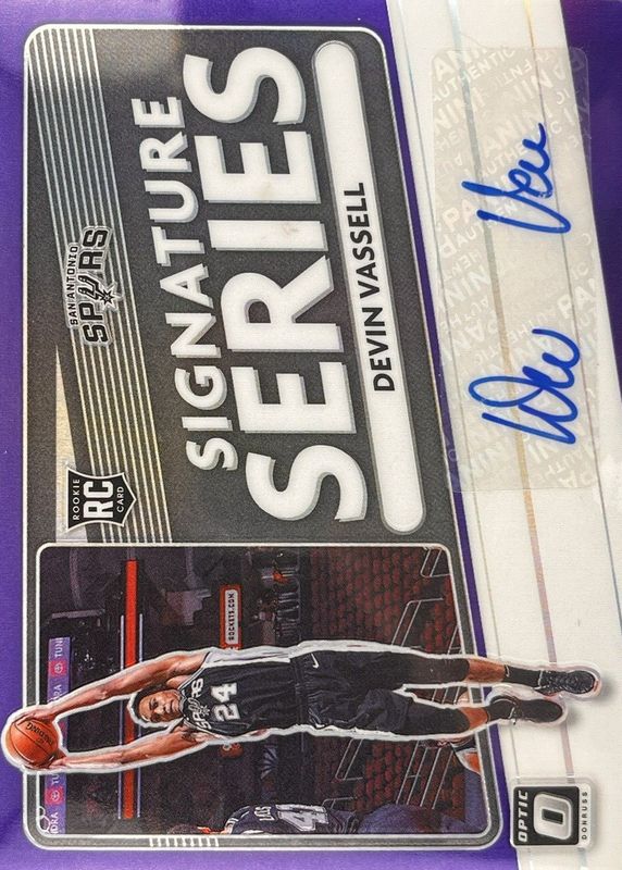 The Devin Vassell 2020 Optic #SS-DVS Signature Series - Purple Rookie card in Raw condition has moved up $3.11 (+28.3%) in the last 30 days and was last sold for $14.11 .