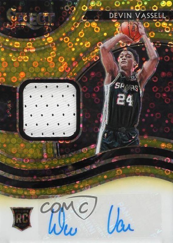 The Devin Vassell 2020 Select #RJA-VAS Rookie Jersey Autographs - Gold Disco /10 card in Raw condition has not changed in price in the last 30 days and was last sold for $133.50 .