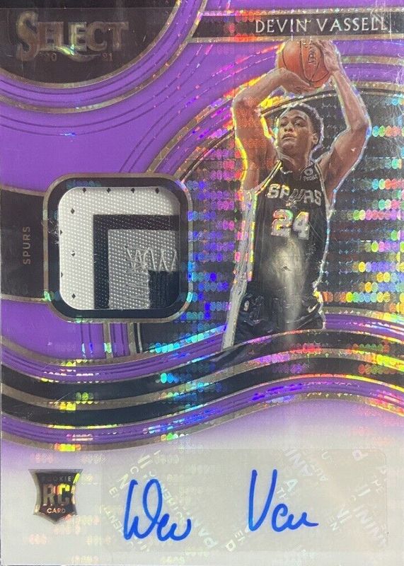 The Devin Vassell 2020 Select #RJA-VAS Rookie Jersey Autographs - Neon Purple Pulsar /15 card in Raw condition has not changed in price in the last 30 days and was last sold for $300.00 .
