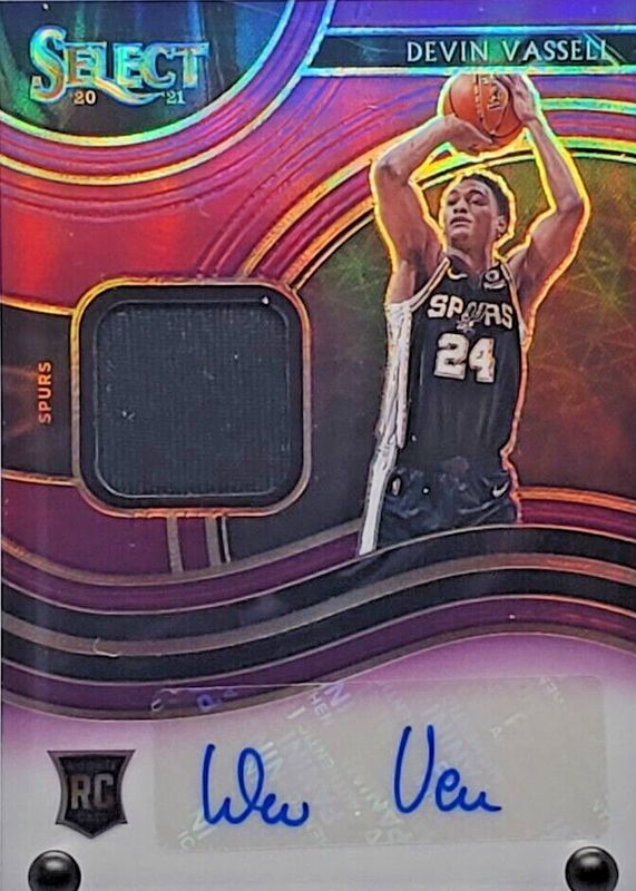 The Devin Vassell 2020 Select #RJA-VAS Rookie Jersey Autographs - Purple /99 card in Raw condition has not changed in price in the last 30 days and was last sold for $13.00 .