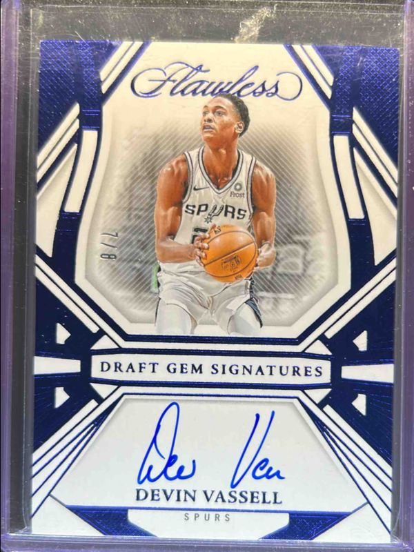 The Devin Vassell 2023 Flawless #DGS-DVV Draft Gem Signatures - Blue /8 card is 1 of 14 Devin Vassell's card variations in the 2023 Flawless set being tracked by Sports Card Investor, including Draft Gem Signatures /25, Flawless Autographs /25, Draft Gem Signatures - Ruby /15, Flawless Autographs - Ruby /15, and Draft Gem Signatures - Gold /10.