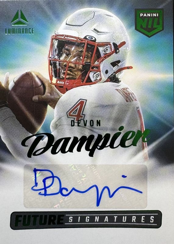 This card is 1 of 4 Devon Dampier's card variations in the 2025 Luminance set being tracked by Sports Card Investor, including Future Signatures NIL, Future Signatures NIL - Purple, and Future Signatures NIL - Red.