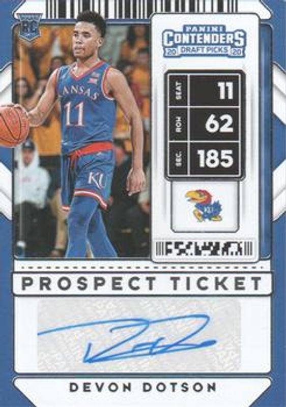 The Devon Dotson 2020 Contenders Draft Picks #91b Base Rookie card is 1 of 52 Devon Dotson's card variations in the 2020 Contenders Draft Picks set being tracked by Sports Card Investor, including #91 Base, #91 Game Ticket Green, #91b Game Ticket Green, #91 Game Ticket Red, and #91b Game Ticket Red.