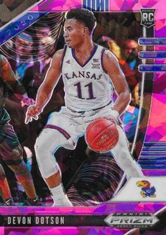 The Devon Dotson 2020 Prizm Draft Picks #72 Pink Ice Rookie card is 1 of 87 Devon Dotson's card variations in the 2020 Prizm Draft Picks set being tracked by Sports Card Investor, including #72 Base, #32 Base, #72 Choice Blue Yellow Green, #32 Choice Blue Yellow Green, and #72 Fast Break.