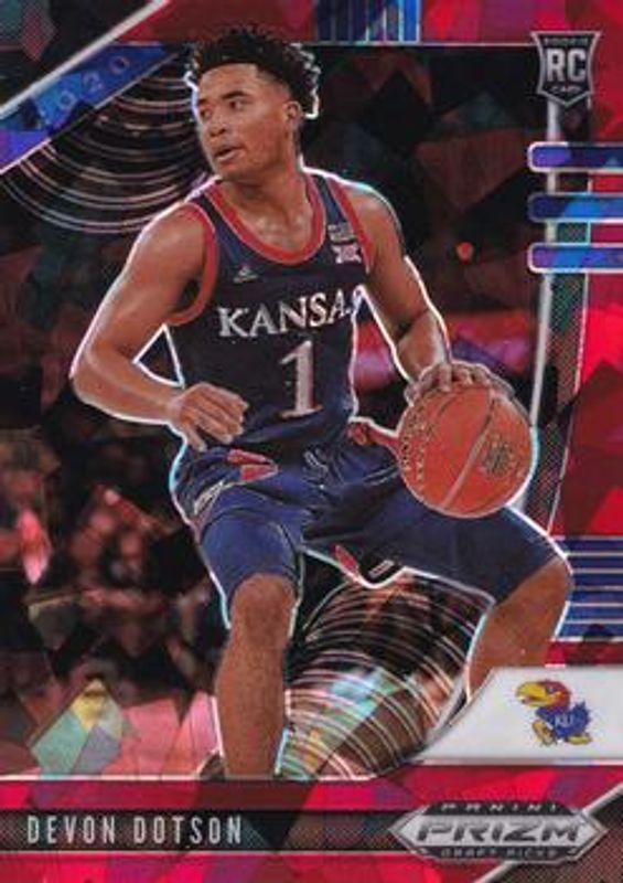 The Devon Dotson 2020 Prizm Draft Picks #32 Red Ice Rookie card is 1 of 87 Devon Dotson's card variations in the 2020 Prizm Draft Picks set being tracked by Sports Card Investor, including #72 Base, #32 Base, #72 Choice Blue Yellow Green, #32 Choice Blue Yellow Green, and #72 Fast Break.