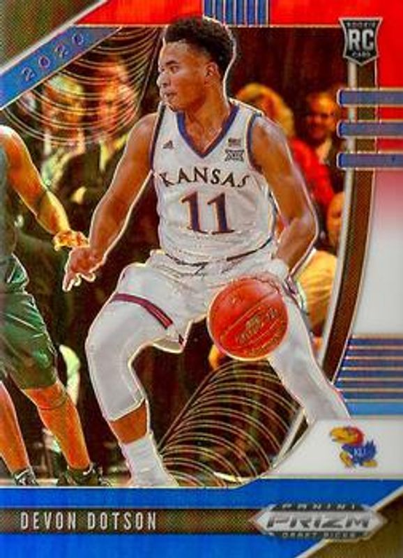 The Devon Dotson 2020 Prizm Draft Picks #72 Red White Blue Rookie card is 1 of 87 Devon Dotson's card variations in the 2020 Prizm Draft Picks set being tracked by Sports Card Investor, including #72 Base, #32 Base, #72 Choice Blue Yellow Green, #32 Choice Blue Yellow Green, and #72 Fast Break.