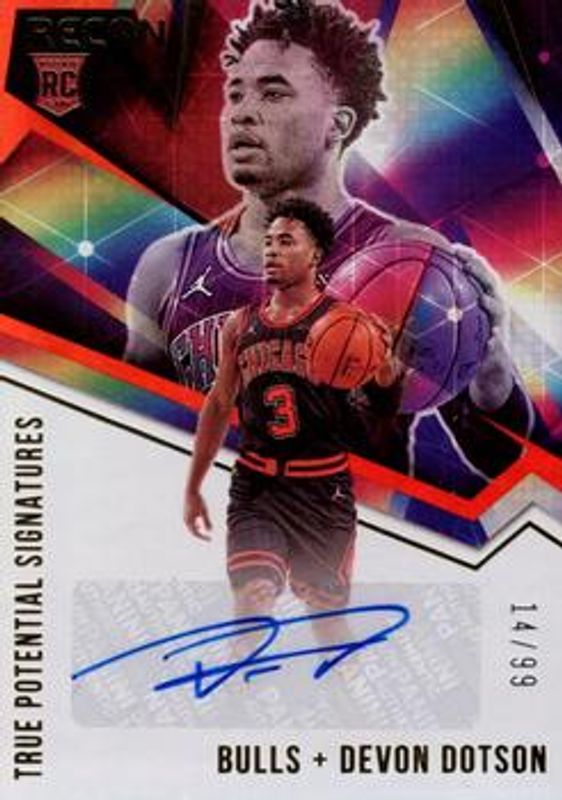 The Devon Dotson 2020 Recon #TPS-DVD True Potential Signatures - Red /99 Rookie card is 1 of 24 Devon Dotson's card variations in the 2020 Recon set being tracked by Sports Card Investor, including Base, Bronze, Holo, Pink, and Spiral.