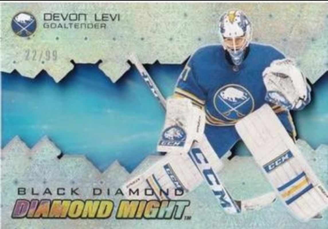 The Devon Levi 2023 Upper Deck Black Diamond #DM-DL Diamond Might /99 Rookie card is 1 of 39 Devon Levi's card variations in the 2023 Upper Deck Black Diamond set being tracked by Sports Card Investor, including Base /349, Red /75, Blue /25, Green /10, and Diamond Relics /5.