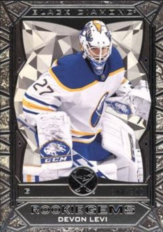 The Devon Levi 2023 Upper Deck Black Diamond #RG-DL Rookie Gems /399 card is 1 of 39 Devon Levi's card variations in the 2023 Upper Deck Black Diamond set being tracked by Sports Card Investor, including Base /349, Red /75, Blue /25, Green /10, and Diamond Relics /5.