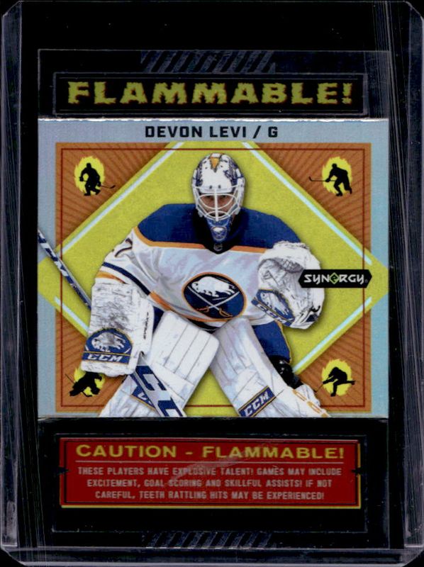 The Devon Levi 2023 Upper Deck Synergy #FL-4 Flammable! Rookie card is 1 of 43 Devon Levi's card variations in the 2023 Upper Deck Synergy set being tracked by Sports Card Investor, including Base /24, Red, Red Codes, Gold /25, and Barnburners!.