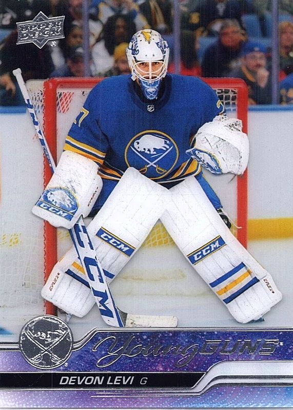 This card is 1 of 9 Devon Levi's card variations in the 2023 Upper Deck set being tracked by Sports Card Investor, including Young Guns Base, Young Guns - Jumbo, Young Guns - Outburst Silver, Young Guns - Deluxe /250, and Young Guns - UD Exclusives /100.