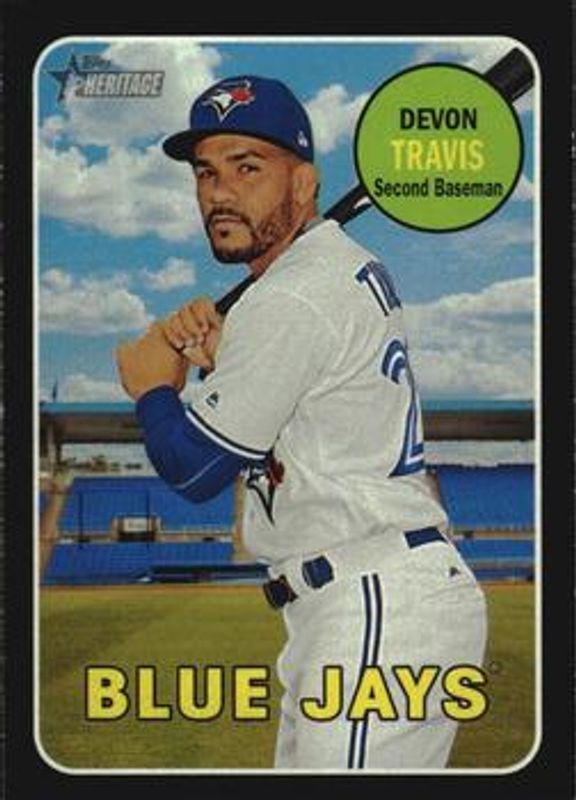 The Devon Travis 2018 Topps Heritage #154 Black Border card is 1 of 7 Devon Travis' card variations in the 2018 Topps Heritage set being tracked by Sports Card Investor, including Base, 100th Anniversary, Magenta Backs, Reverse Stock, and 5x7 /49.