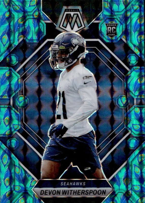 The Devon Witherspoon 2023 Mosaic #313 Choice Peacock /(SSP) Rookie card in Raw condition has not changed in price in the last 30 days and was last sold for $50.00 .