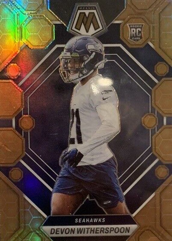 The Devon Witherspoon 2023 Mosaic #313 Honeycomb /(SSP) Rookie card in Raw condition has not changed in price in the last 30 days and was last sold for $19.99 .