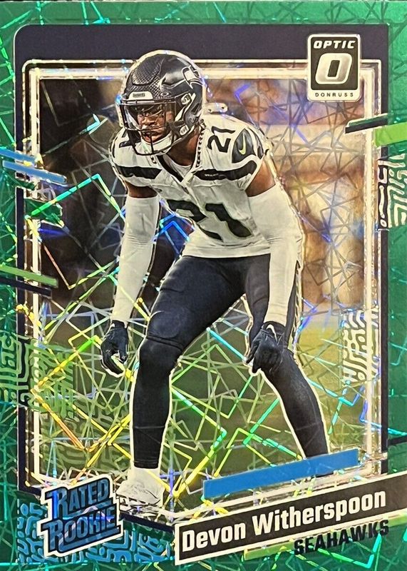 The Devon Witherspoon 2023 Optic #292 Green Velocity Rookie card in Raw condition has moved up $2.01 (+67.2%) in the last 30 days and was last sold for $5.00 .