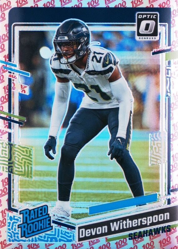 The Devon Witherspoon 2023 Optic #292 One Hundred /(SSP) Rookie card in Raw condition has not changed in price in the last 30 days and was last sold for $21.99 .
