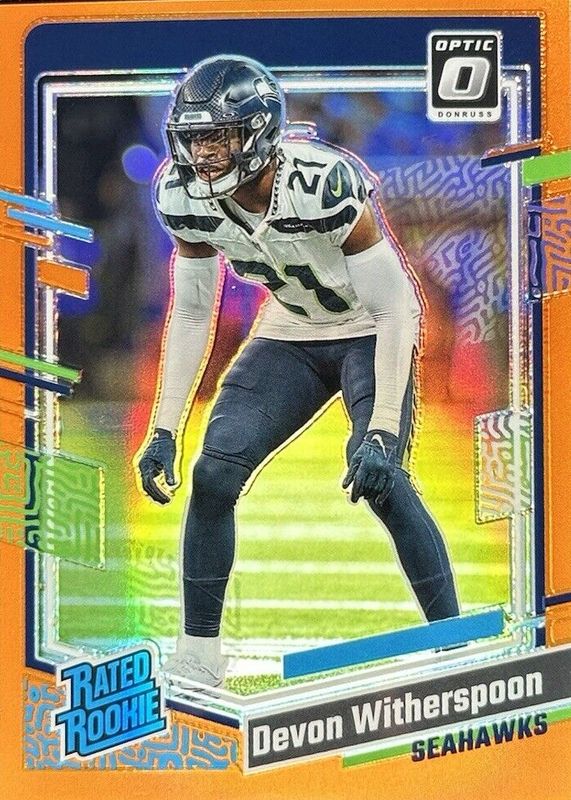 The Devon Witherspoon 2023 Optic #292 Orange /249 Rookie card in Raw condition has moved up $0.99 (+16.5%) in the last 30 days and was last sold for $6.99 .