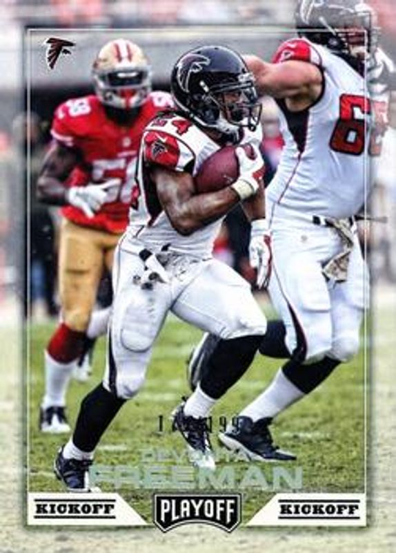 The Devonta Freeman 2016 Playoff #8 Kickoff /199 card is 1 of 31 Devonta Freeman's card variations in the 2016 Playoff set being tracked by Sports Card Investor, including Base, Goal Line, 1st Down /99, 2nd Down /49, and 3rd Down /25.