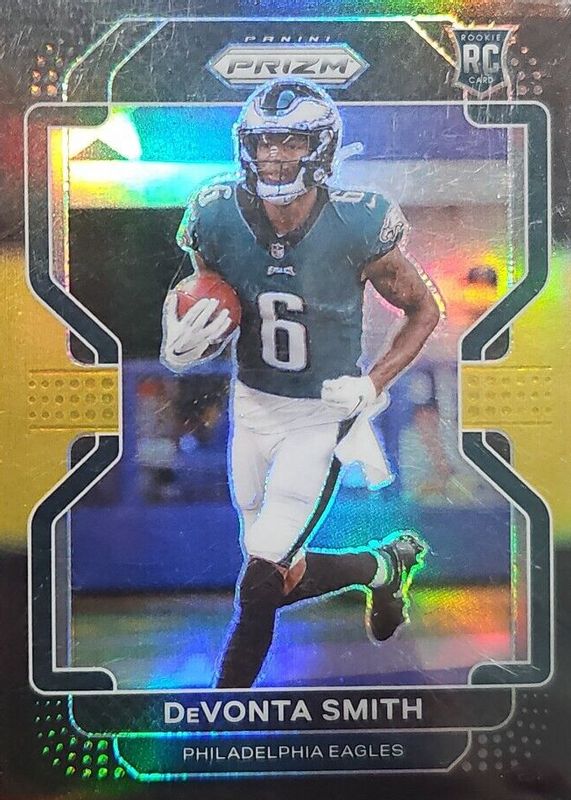 The DeVonta Smith 2021 Chronicles #PB-8 Prizm Black - Gold /10 Rookie card in Raw condition has not changed in price in the last 30 days and was last sold for $35.00 .