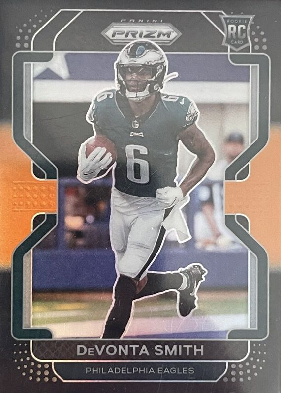 The DeVonta Smith 2021 Chronicles #PB-8 Prizm Black - Orange /75 Rookie card in Raw condition has not changed in price in the last 30 days and was last sold for $13.05 .