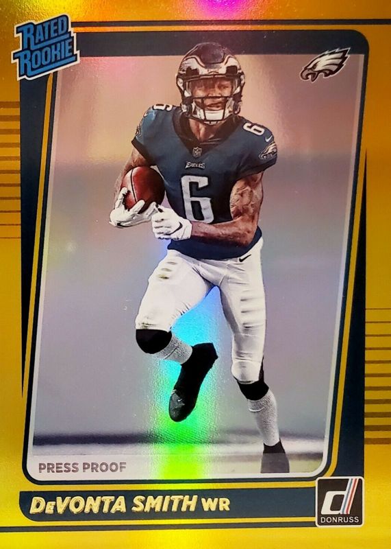The DeVonta Smith 2021 Donruss #261 Press Proof Premium Rookie card in Raw condition has moved up $2.67 (+115%) in the last 30 days and was last sold for $5.00 .