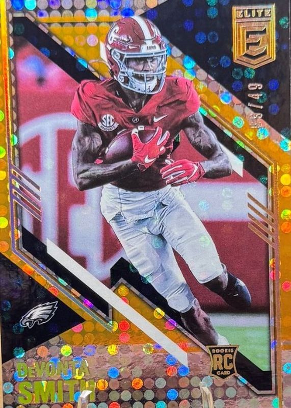 The DeVonta Smith 2021 Elite #120 Orange /49 Rookie card in Raw condition has not changed in price in the last 30 days and was last sold for $9.00 .
