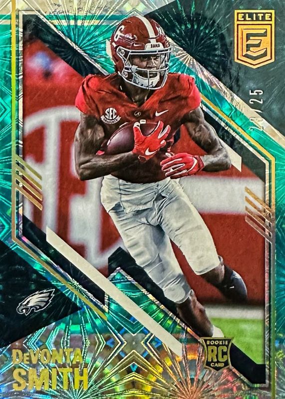 This card is 1 of 20 DeVonta Smith's card variations in the 2021 Elite set being tracked by Sports Card Investor, including Base Rookie /599, Green, Pink, Aspirations Shimmer /499, and Red /399.