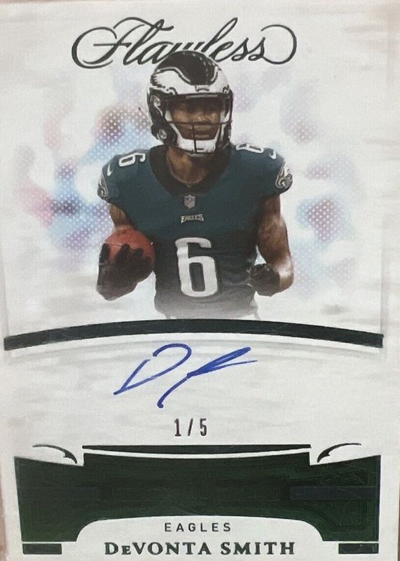 The DeVonta Smith 2021 Flawless #FRS-DVS Flawless Rookie Signatures - Emerald /5 card in Raw condition has not changed in price in the last 30 days and was last sold for $290.00 .