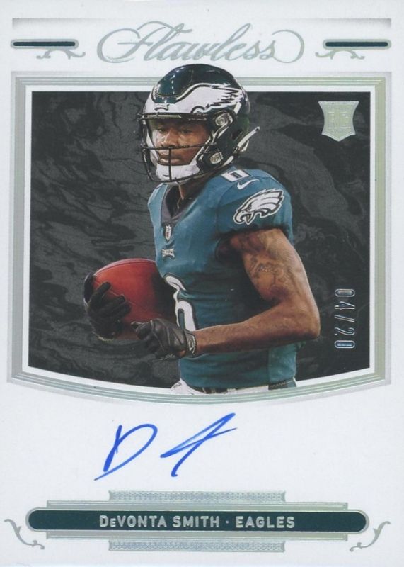 The DeVonta Smith 2021 Flawless #RSS-DVS Rookie Shadow Signatures - Silver (/20) card in Raw condition has not changed in price in the last 30 days and was last sold for $131.00 .
