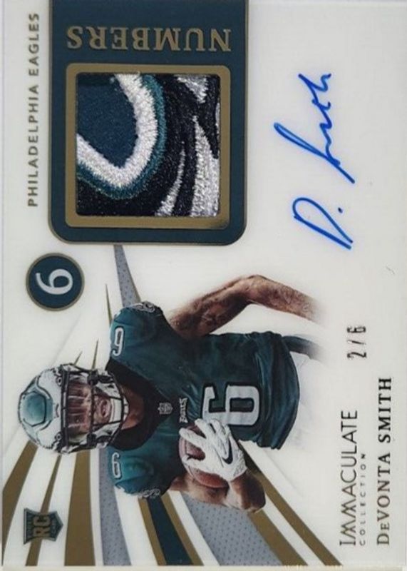 The DeVonta Smith 2021 Immaculate #INA-DS Immaculate Numbers Rookie Patch Autographs (/6) card in Raw condition has not changed in price in the last 30 days and was last sold for $375.00 .