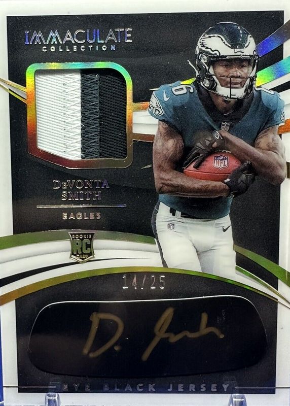 The DeVonta Smith 2021 Immaculate #REB-DS Immaculate Rookie Eye Black Jersey Autographs - Gold (/25) card in Raw condition has not changed in price in the last 30 days and was last sold for $110.50 .