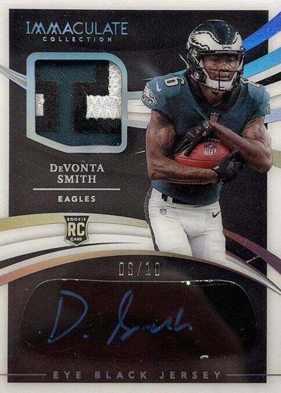 The DeVonta Smith 2021 Immaculate #REB-DS Immaculate Rookie Eye Black Jersey Autographs - Metallic /10 card in Raw condition has not changed in price in the last 30 days and was last sold for $125.00 .