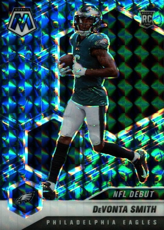 The DeVonta Smith 2021 Mosaic #246 NFL Debut - Choice Peacock /(SSP) Rookie card in Raw condition has not changed in price in the last 30 days and was last sold for $75.00 .