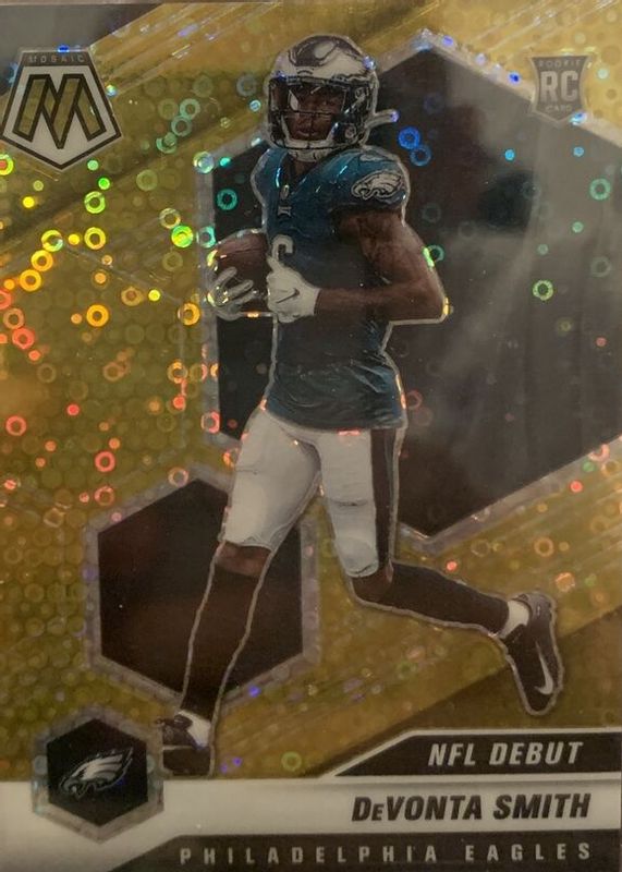The DeVonta Smith 2021 Mosaic #246 NFL Debut - No Huddle Gold /10 Rookie card in Raw condition has not changed in price in the last 30 days and was last sold for $112.50 .