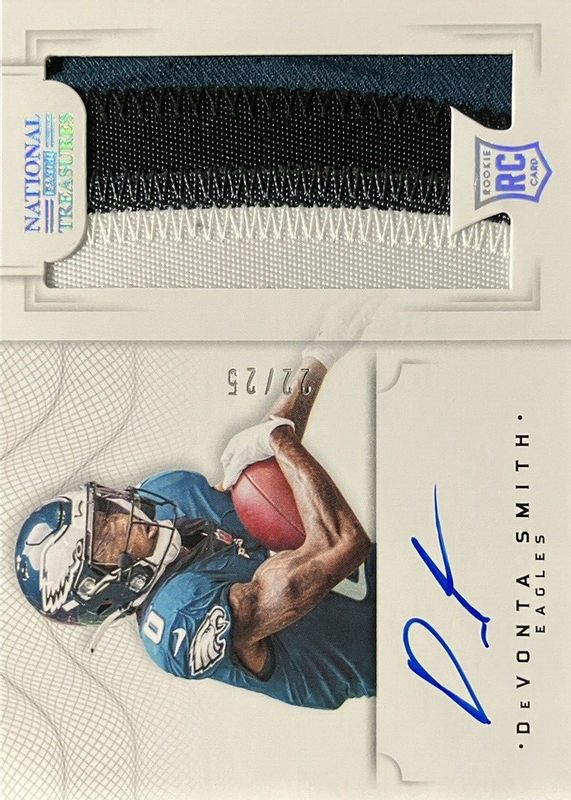 This card is 1 of 57 DeVonta Smith's card variations in the 2021 National Treasures set being tracked by Sports Card Investor, including Rookie Patch Auto /99, Rookie Patch Auto - Green Jersey Number (/6), Rookie Patch Auto - Purple /49, Rookie Patch Auto - Holo Silver /25, and Rookie Patch Auto - Stars & Stripes Holo Silver /25.
