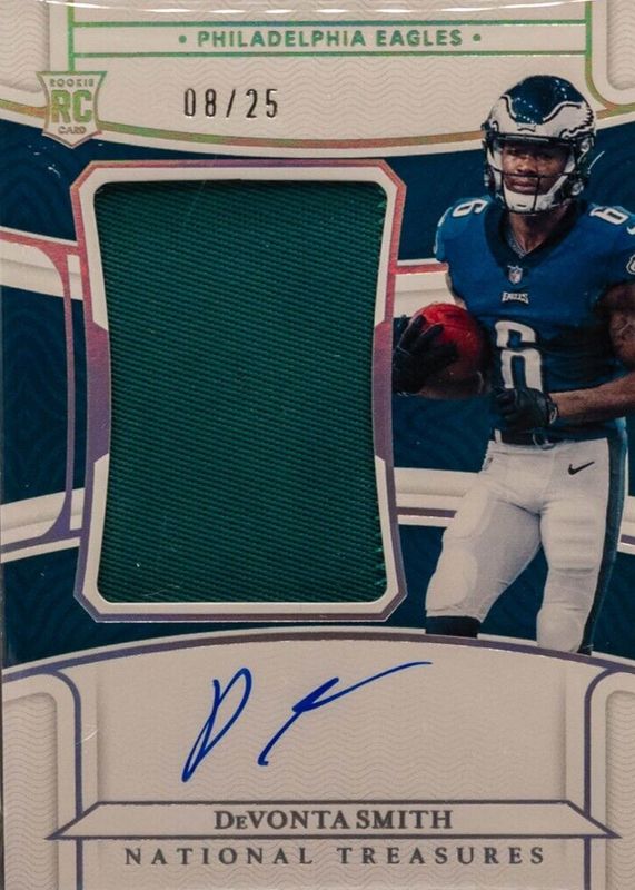 This card is 1 of 57 DeVonta Smith's card variations in the 2021 National Treasures set being tracked by Sports Card Investor, including Rookie Patch Auto /99, Rookie Patch Auto - Green Jersey Number (/6), Rookie Patch Auto - Purple /49, Rookie Patch Auto - Stars & Stripes Holo Silver /25, and Rookie Patch Auto - Midnight /20.