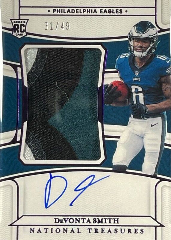 This card is 1 of 57 DeVonta Smith's card variations in the 2021 National Treasures set being tracked by Sports Card Investor, including Rookie Patch Auto /99, Rookie Patch Auto - Green Jersey Number (/6), Rookie Patch Auto - Holo Silver /25, Rookie Patch Auto - Stars & Stripes Holo Silver /25, and Rookie Patch Auto - Midnight /20.