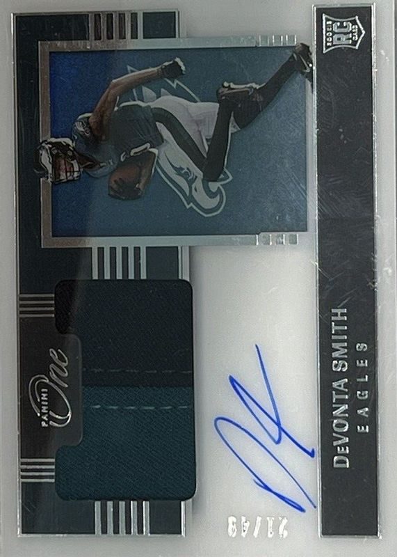The DeVonta Smith 2021 One #120 Premium Rookie Patch Autographs (/49) card in Raw condition has not changed in price in the last 30 days and was last sold for $105.00 .
