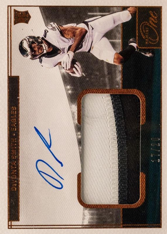This card is 1 of 36 DeVonta Smith's card variations in the 2021 One set being tracked by Sports Card Investor, including Precision Rookie Patch Autographs (/30), Precision Rookie Patch Autographs - Blue (/25), Precision Rookie Patch Autographs - Bronze (/20), Precision Rookie Patch Autographs - Gold (/10), and Precision Rookie Patch Autographs - Red (/15).