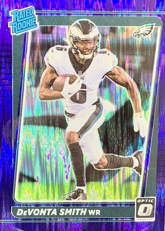 The DeVonta Smith 2021 Optic #205 Purple Shock Rookie card in Raw condition has moved up $0.99 (+39.7%) in the last 30 days and was last sold for $3.49 .