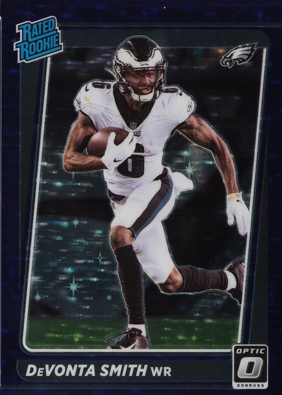 This card is 1 of 74 DeVonta Smith's card variations in the 2021 Optic set being tracked by Sports Card Investor, including Base, Blue Hyper, Blue Scope, Bronze, and Green Velocity.