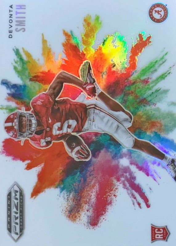 This card is 1 of 17 DeVonta Smith's card variations in the 2021 Prizm Draft Picks set being tracked by Sports Card Investor, including Base, All-Americans, All-Americans - Green, All-Americans - Purple Wave, and All-Americans - Silver.