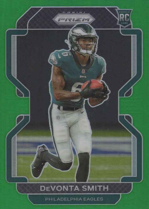 The DeVonta Smith 2021 Prizm #335 Green Rookie card in Raw condition has moved up $0.31 (+4.9%) in the last 30 days and was last sold for $6.58 .