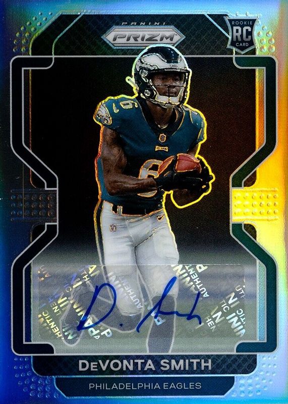 The DeVonta Smith 2021 Prizm #335 Rookie Autographs - Silver card in Raw condition has moved up $17.12 (+38.1%) in the last 30 days and was last sold for $62.00 .