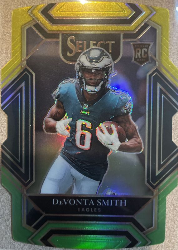 The DeVonta Smith 2021 Select #249 Club Level Green & Yellow Die-Cut Rookie card in Raw condition has moved up $13.75 (+687%) in the last 30 days and was last sold for $15.75 .