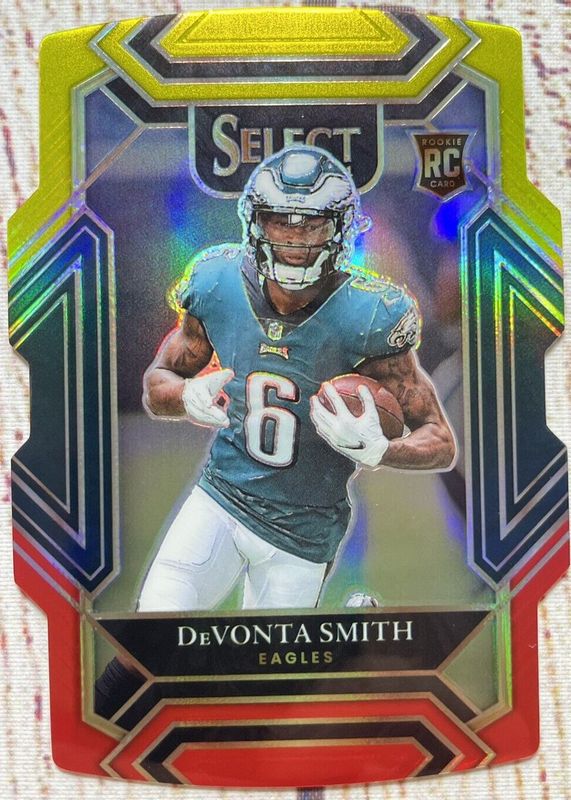 2021 Select DeVonta Smith RC Red and Yellow Prizm Die Cut Club #249 Eagles