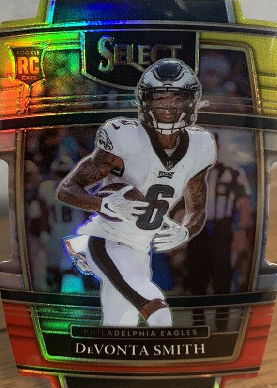 The DeVonta Smith 2021 Select #49 Concourse Red & Yellow Die-Cut Rookie card in Raw condition has moved up $1.49 (+149%) in the last 30 days and was last sold for $2.49 .