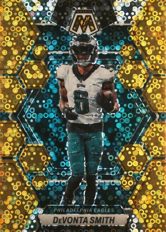 This card is 1 of 8 DeVonta Smith's card variations in the 2023 Mosaic set being tracked by Sports Card Investor, including Choice Peacock /(SSP), Genesis /(SSP), Honeycomb /(SSP), White Sparkle /(SSP), and Black /1.