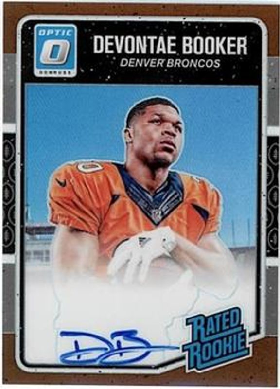 The DeVontae Booker 2016 Optic #166 Rated Rookies Autographs - Bronze card is 1 of 39 DeVontae Booker's card variations in the 2016 Optic set being tracked by Sports Card Investor, including Base, Bronze, Holo, Pink, and Purple.